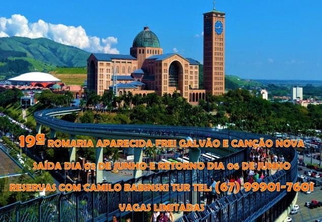 A romaria será no feriado de Corpus Christi, a saída será no dia 03 e o retorno será no dia 06 de junho. Maiores informações e reserva de passagem pelo celular (067) 99901-7601, com Camilo Babinski, as vagas são limitadas.