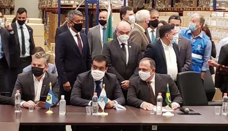 O ministro da Saúde, Eduardo Pazuello, e secretários estaduais de saúde de todo o Brasil, entre eles Gealdo Resende, participam do ato de entrega das doses da Coronavac para o estados. A distribuição ocorre um dia após a deliberação da Anvisa (Agência Nacional de Vigilância Sanitária) que aprovou o uso emergencial da Coronavac e da vacina Astrazeneca, que será produzida na Fiocruz.