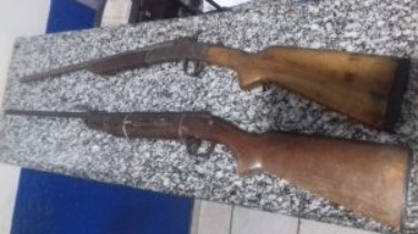 Quando os policiais militares chegaram ao local, o autor saiu correndo. Durante buscas na residência foram localizadas duas espingardas, sendo uma calibre 22 e outra 28, ambas sem numeração. Na espingarda calibre 28 havia um cartucho deflagrado.