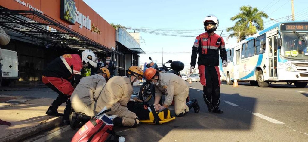 Ciclista, que não teve a identidade divulgada, foi socorrido após acidente com motocicleta na Avenida Bandeirantes, no Bairro Amambaí, em Campo Grande. O motociclista teria fugido do local e a vítima chegou a ficar inconsciente após a batida.