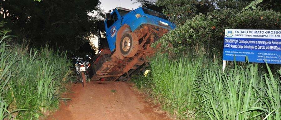 Uma ponte de madeira localizada na estrada vicinal da MS-450, em Aquidauana, a 141 quilômetros de Campo Grande, desabou nesta terça-feira (30), depois de não aguentar o peso da carga de um caminhão guincho. Uma máquina escavadeira caiu no córrego.