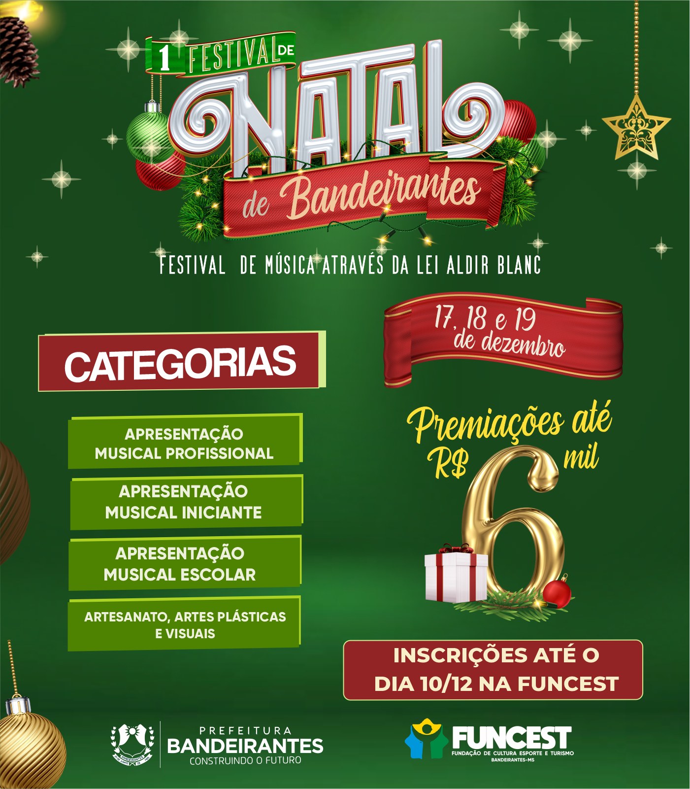 Bandeirantes ira realizar nos dias 17,18  e 19 de dezembro, o Primeiro Festival Musical de Natal . Com premiações de até R$ 6 mil reais através da Lei Aldair Blanc.