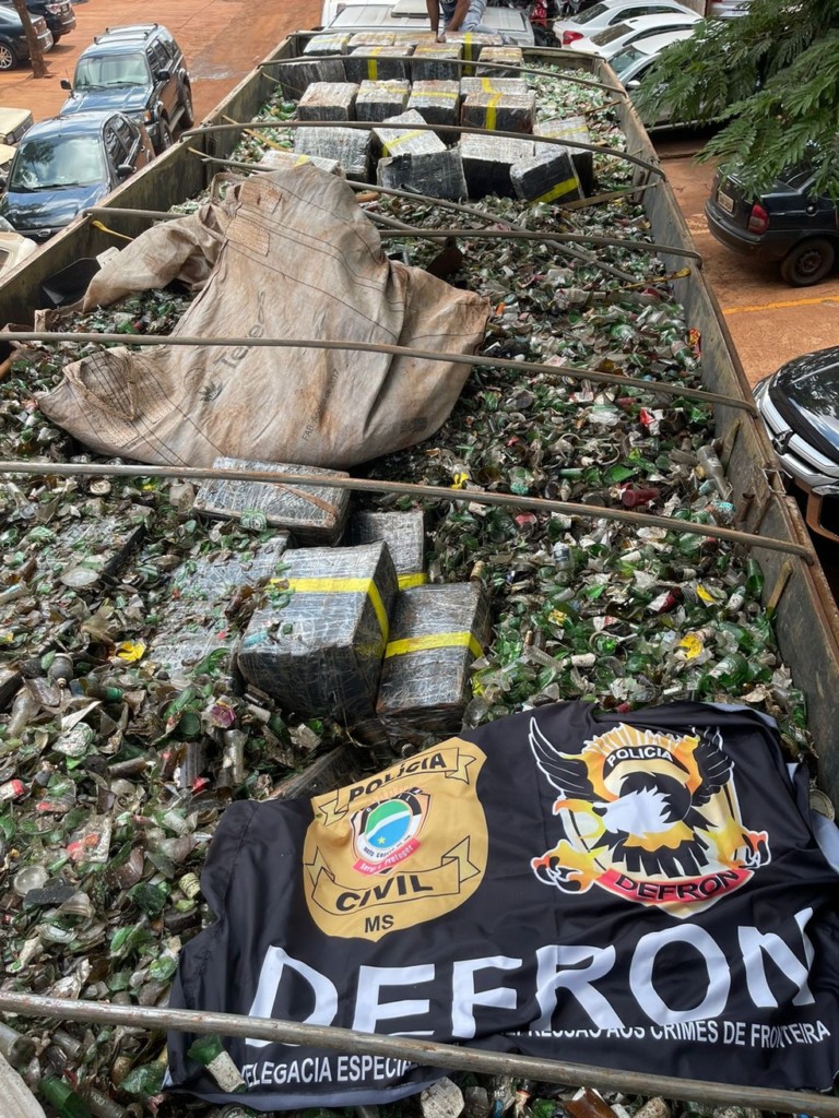 A Delegacia Especializada de Repressão aos Crimes de Fronteira (Defron) apreendeu 1,8 tonelada de maconha que estava escondida em meio a cacos de vidro que seriam levados para reciclagem.