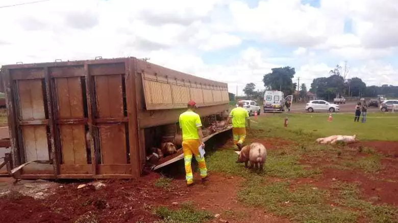 Caminhão carregado com porcos tombou, na manhã desta quinta-feira (13), na BR-163, em Dourados, cidade a 251 quilômetros de Campo Grande. O trânsito chegou a ficar lento na rodovia.