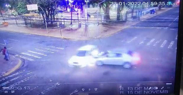 Pelas imagens do sistema do centro de vigilância de videomonitoramento da guarda municipal, é possível ver quando o Corolla passa pelo cruzamento das ruas e acerta o Fiat Argo que acaba capotando. O morador de rua que aparece em pé na calçada acaba atingido pelo veículo.