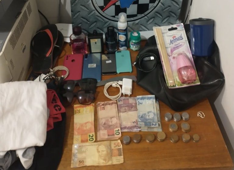 Diante as informações os policiais iniciaram diligências momento em que no cruzamento das ruas Bruno Garcia com Elvirio Mario Mancini, visualizaram 02 indivíduos que demonstraram suspeição, sendo procedido a abordagem policial no que foi localizado na veste do elemento de 20 anos, 01 celular, certa quantia em dinheiro, e durante vistoria na mochila que este trazia consigo foi localizado 01 aparelho celular, perfumes, carregadores de celular, óculos de sol.