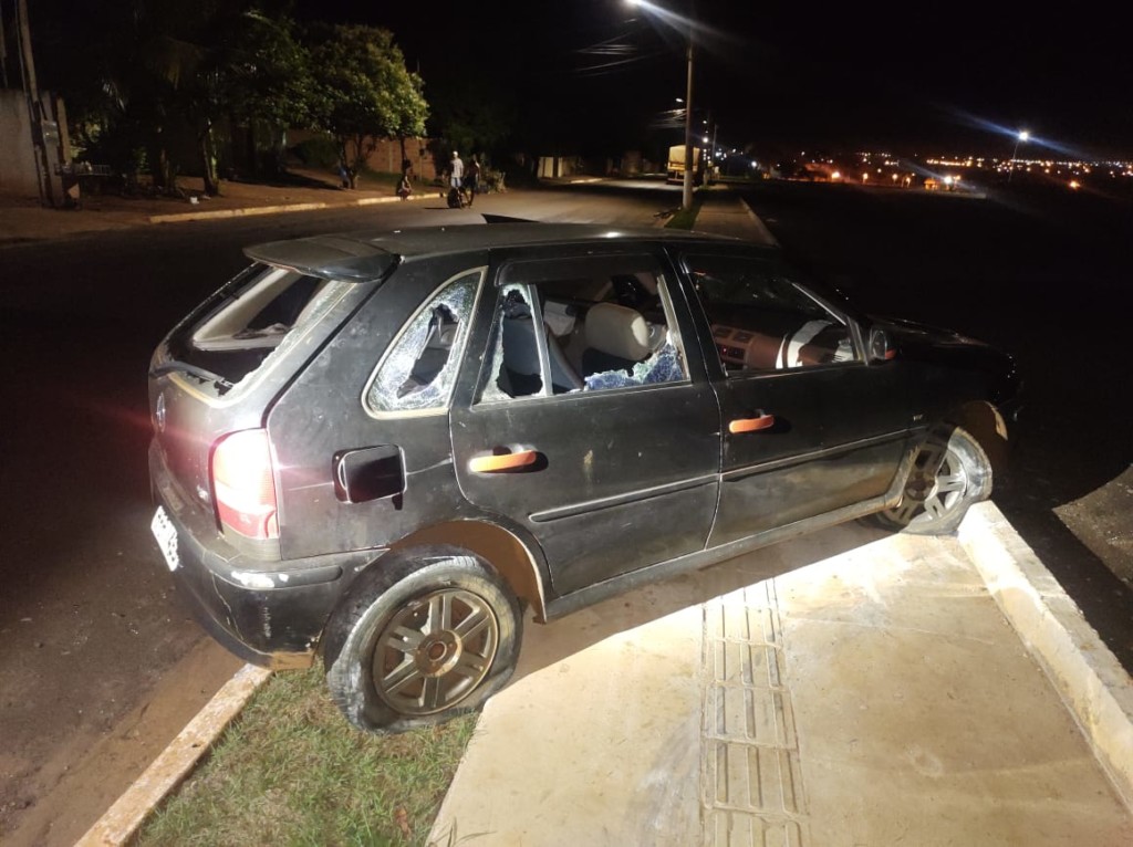 O veículo Volkswagen Gol da cor preta, ficou totalmente danificado, com três pneus estourados, pois o indivíduo subiu no meio fio em alta velocidade estourando os pneus, todos os vidros do veículo estão quebrados o veículo sem condições de ser retirado do local.
