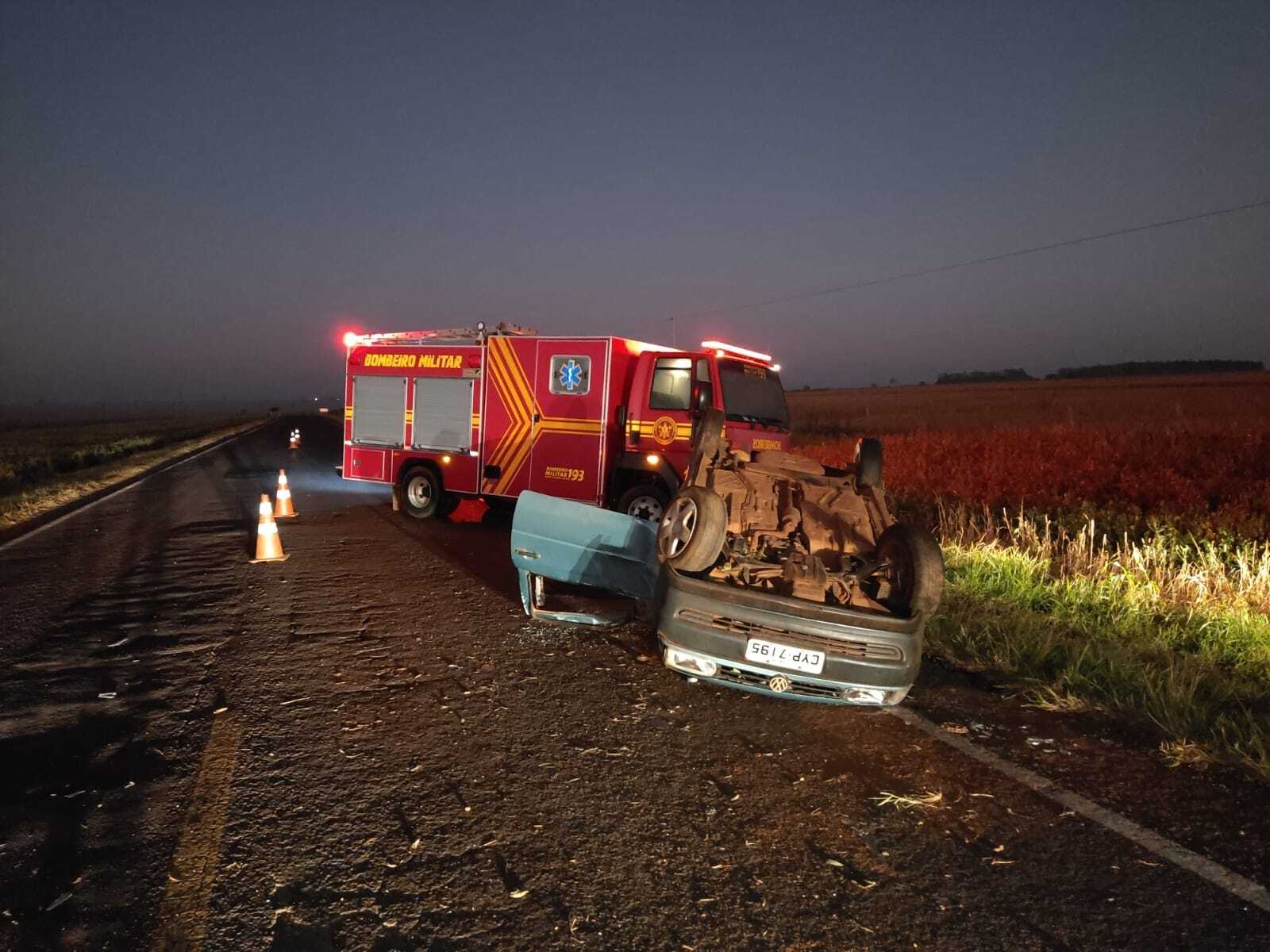 Por volta das 4h, o Corpo de Bombeiros foi acionado para atender ocorrência de acidente de trânsito e quando chegou ao local encontrou um VW Gol, com placa do Mercosul, com as quatro rodas para cima no meio da pista.