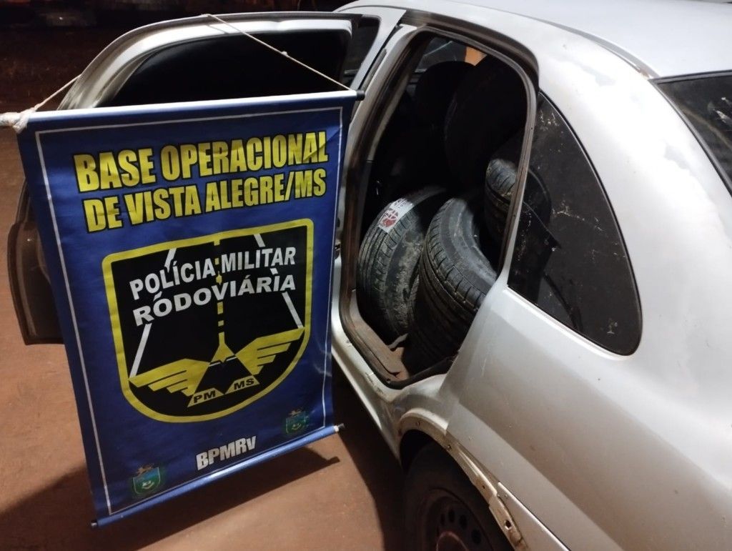 Durante buscas no veículo foram localizados diversas mercadorias de origem estrangeira (pneus e vestuarios).