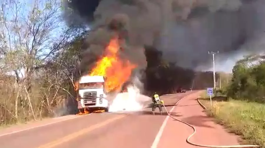 Caminhão é tomado por incêndio após pneu próximo ao tanque de combustível estourar