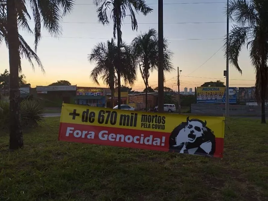 O canteiro na Avenida Euler de Azevedo com a Tamandaré amanheceu com uma faixa de protesto contra o presidente Jair Bolsonaro (PL). Ele visita Campo Grande nesta quinta-feira (30). Suspensa entre duas árvores, a faixa chama atenção para as mais de 670 mil mortes causadas pela Covid no Brasil até o momento, motivo pelo qual o chefe do executivo nacional é amplamente criticado ao longo dos mais de 2 anos de pandemia.