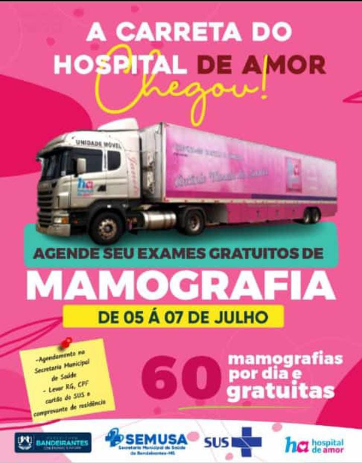 A Prefeitura Municipal através da Secretaria Municipal de Saúde trás mais uma vez para o munícipio a unidade móvel do Hospital de Amor, nos dias 05, 06 e 07 de julho.