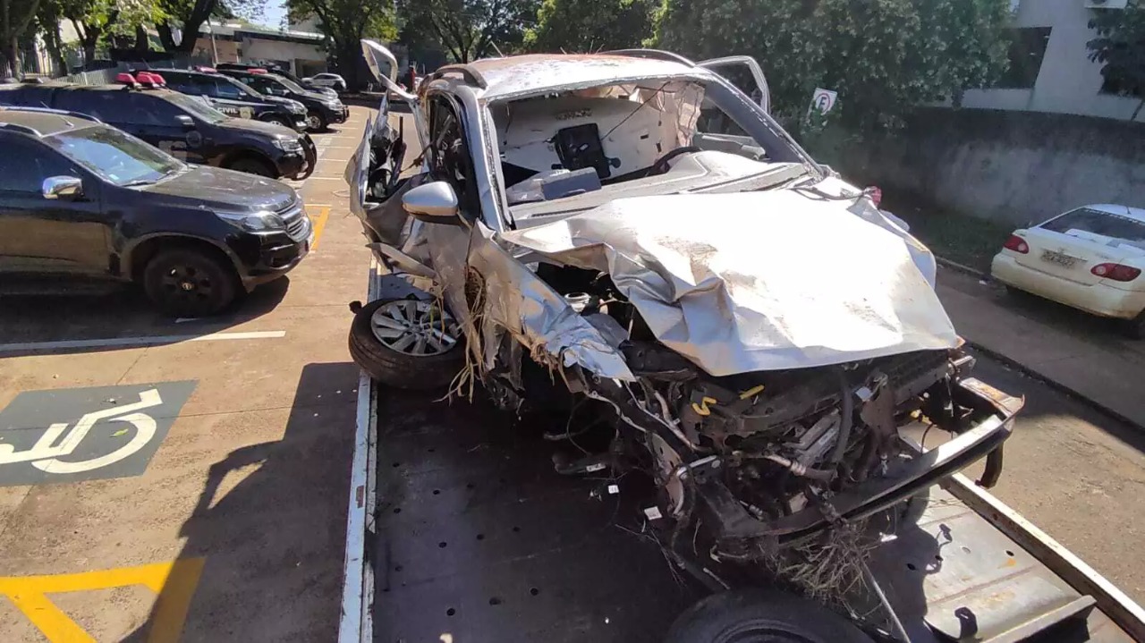 Motorista do tráfico destruiu um SUV Volkswagen T-Cross na manhã desta sexta-feira (26) enquanto tentava fugir da polícia transportando 1.102 quilos de maconha. O veículo ficou todo retorcido e Michael Adão Salinas, 26, sofreu fratura na perna esquerda.