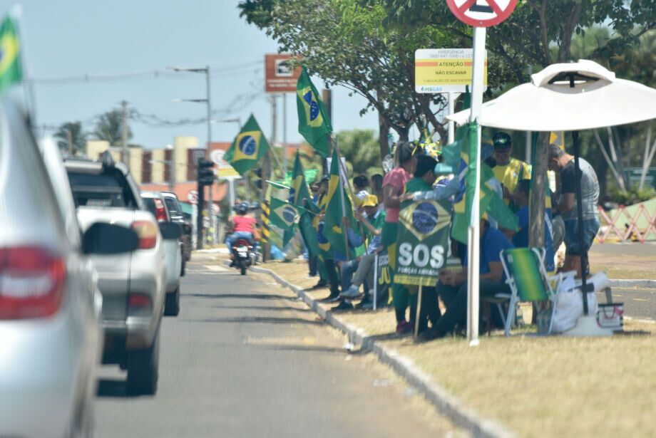 Com pessoas espalhadas pelos canteiros, hasteando bandeiras debaixo do sol, entre os manifestantes as tradicionais frases prontas contra o resultado da eleição, são repetidas também nesses atos antidemocráticos em Campo Grande.