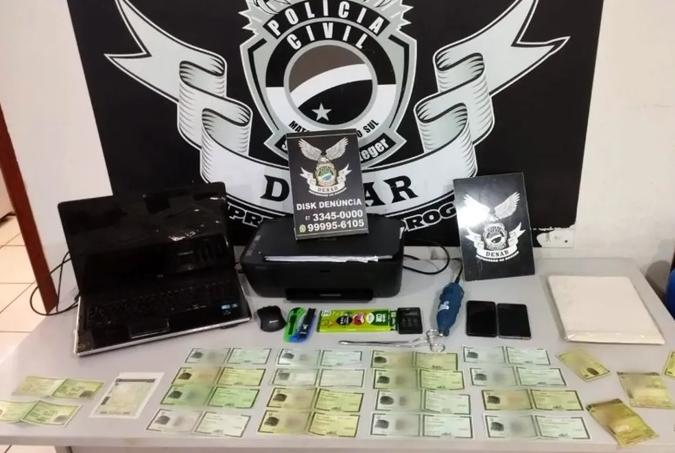 A Polícia Civil descobriu um laboratório para falsificação de documentos durante o cumprimento de um mandado de prisão, em Campo Grande, nessa terça-feira (22). Um homem, de 27 anos, estava foragido desde 2019 por tráfico de drogas e foi indiciado por falsificação de documentos.