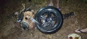 Parte do motor e uma das rodas da Saveiro, arrancados durante a batida. (Foto: Rádio Caçula)