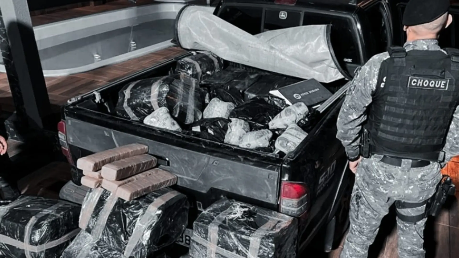 Informações são de que as equipes estavam em patrulhamento quando identificaram uma caminhonete, com placas de Minas Gerais, quando desconfiaram de que estava carregando drogas. Foi dada ordem de parada, que inicialmente foi desobedecida, mas depois o traficante acabou parando.