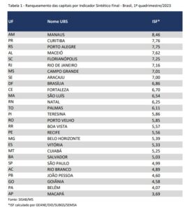 Conforme o relatório, a capital sul-mato-grossense alcançou o Índice Sintético Final (ISF) de 7,01, à frente das cidades de Brasília-DF (6,86) e Cuiabá-MT(5,25). No ranking geral, Campo Grande aparece na sétima colocação, ficando atrás das cidades de Manaus-AM (8,45), Curitiba-PR (7,76), Porto Alegre-RS (7,75), Maceió-AL (7,62), Florianópolis-SC (7,25) e Rio de Janeiro (7,16).