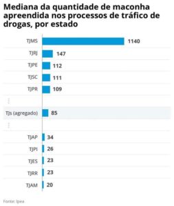 Mato Grosso do Sul é o estado com maior média “per capita” de maconha apreendida. As análises foram feitas pelo cálculo da quantidade de droga encontrada com detidos e processados por tráfico de drogas. Os dados são de uma pesquisa divulgada pelo Ipea (Instituto de Pesquisa Econômica Aplicada) e foram repercutidos em uma reportagem do jornal O Globo.