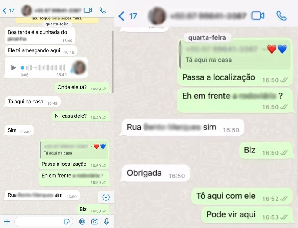 Os prints da conversa entre a vítima e a Polícia Civil da cidade foram divulgados nesta sexta-feira (9). Na troca de mensagens é possível ver que a mulher manda um áudio e logo em seguida a localização do local do fato.