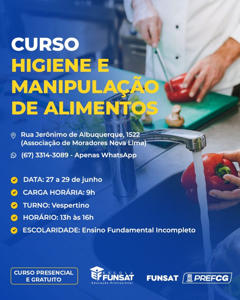 A Escola da Funsat (Fundação Social do Trabalho) vai promover de 27 a 29 de junho, na Associação de Moradores do Bairro Nova Lima, o curso de Higiene na Manipulação de Alimentos. São 30 vagas no total e as inscrições estão abertas. As aulas serão realizadas das 13 às 16h.