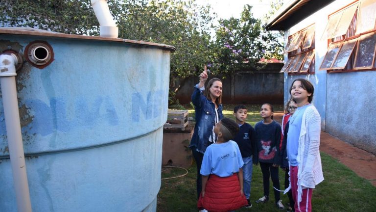 Com dois reservatórios de 7 mil litros cada, a Escola Municipal Antônio José Paniago, localizada no Bairro Jardim Itamaracá, em Campo Grande, utiliza a água armazenada para limpeza da unidade, além do ginásio e ensina aos alunos sobre economia e preservação do meio ambiente.