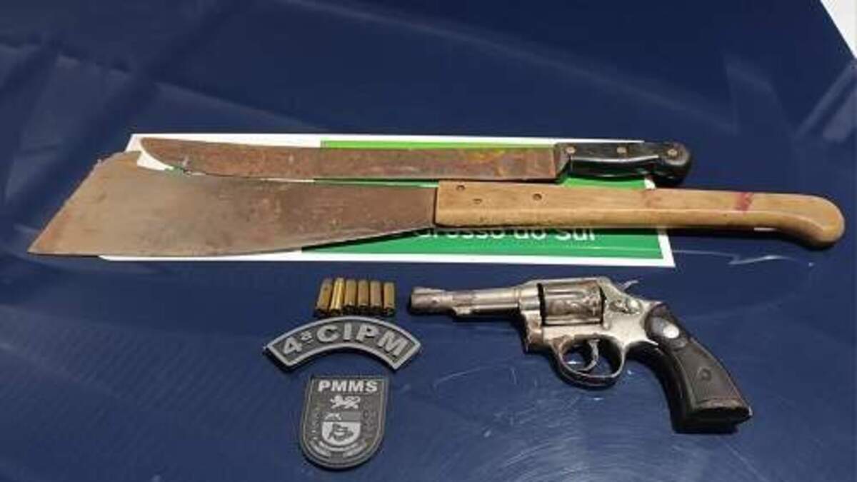 O suspeito atingiu o sogro com um facão no braço e conseguiu pegar a arma, que caiu no chão.