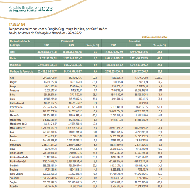 O gasto total em segurança teve crescimento de 11,6% em relação ao ano anterior justamente pelo maior volume de despesas estaduais, essas 12,9% em relação a 2021. Mato Grosso do Sul se destacou neste levantamento.