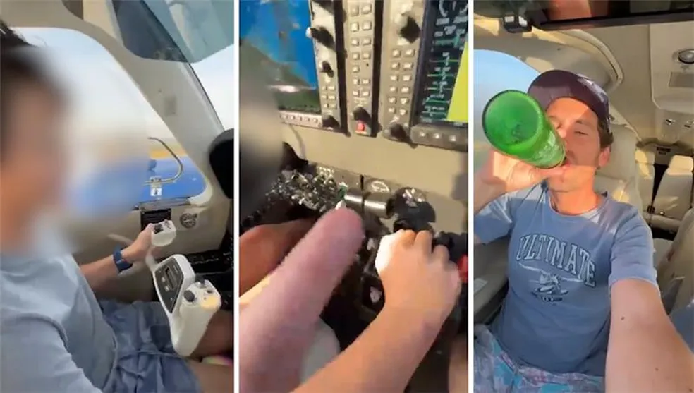 Na mesma gravação, o homem aparecebebendo uma cerveja enquanto o menino manuseia sozinho o manche do avião. “O passageiro pode tomar uma, né Kiko?”, pergunta ao garoto.