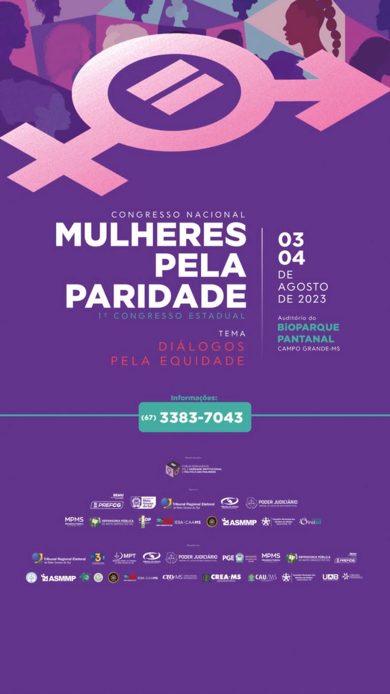 Além disso, na abertura do Congresso, serão formalizadas adesões das seguintes instituições que passarão a compor o Fórum Permanente Pela Paridade Institucional e Política das Mulheres: Tribunal de Contas do Estado de Mato Grosso do Sul (TCE/MS), Ministério Público do Trabalho em Mato Grosso do Sul – PRT 24ª Região (MPT 24ª Região), Procuradoria-Geral do Estado de Mato Grosso do Sul (PGE/MS) e Associação Nacional dos Procuradores dos Estados e do Distrito Federal (ANAPE).
