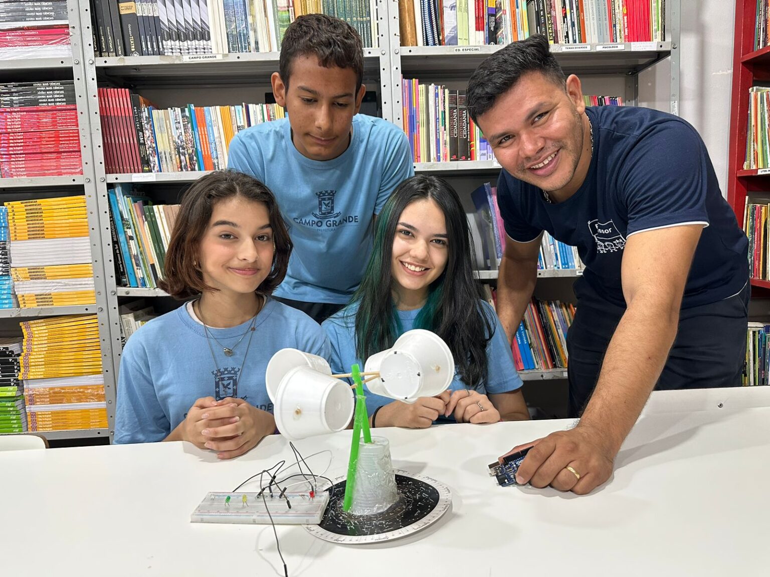 Três alunos do 8º ano da Escola Municipal Doutor Tertuliano Meireles, em Campo Grande, se dedicaram durante as férias escolares no trabalho de um protótipo de anemômetro, instrumento que calcula a velocidade do vento, feito de materiais recicláveis e conseguiram se classificar para a fase final da FEBIC (Feira Brasileira de Iniciação Científica), em outubro, em Santa Catarina.