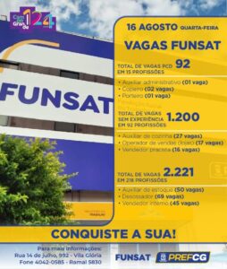 A Fundação Social do Trabalho (Funsat) oferece 2.221 vagas de emprego nesta quarta-feira (16). As contratações são para 218 profissões, em 266 empresas de Campo Grande. De acordo com a Funsat, são 113 vagas para auxiliar de linha de produção, 107 vagas para açougueiro, 59 vagas para ajudante de carga e descarga de mercadoria, 38 vagas para auxiliar de cozinha, 26 vagas para magarefe e 7 vagas para frentista.
