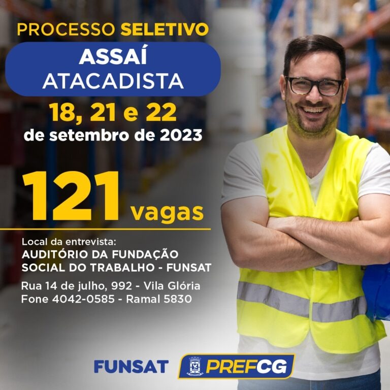 Em parceria com a Funsat (Fundação Social do Trabalho), o Assaí Atacadista vai realizar três dias de processo seletivo na sede da Fundação, disponibilizando 121 vagas para 12 funções diferentes. A seleção de candidatos acontecerá nos dias 18, 21 e 22 de setembro, das 08h às 12h, na Rua 14 de Julho, 992, Vila Glória.