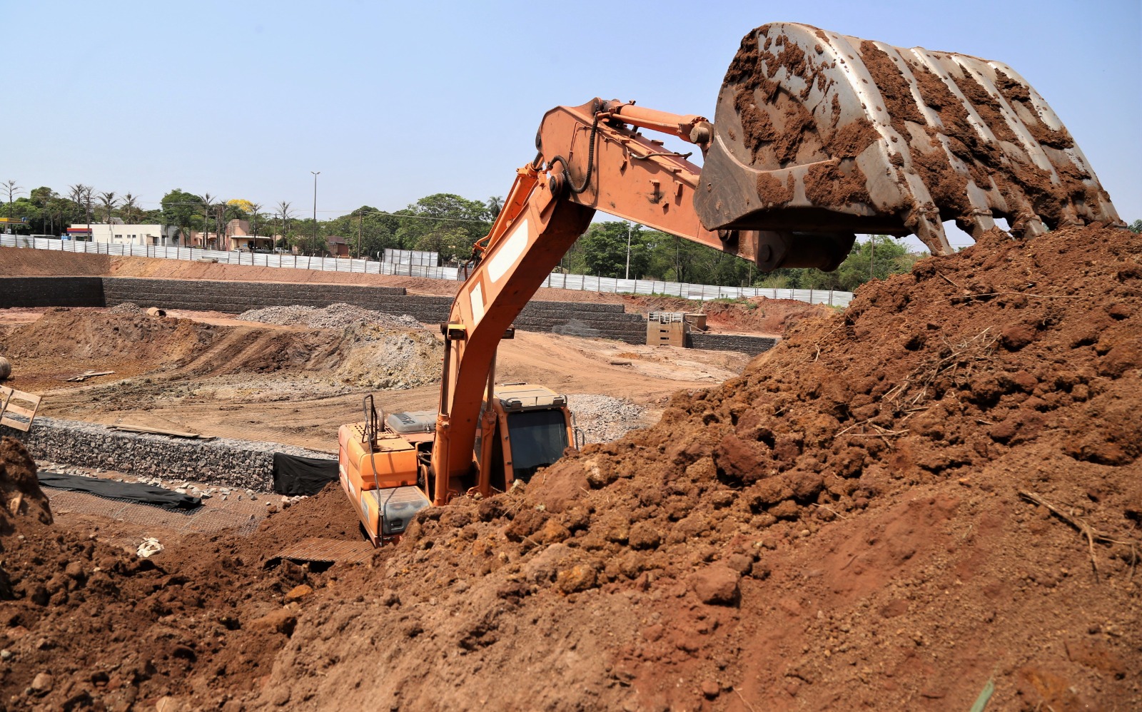 Mais de 25 operários, três escavadeiras, rolo compactador e quatro caminhões trabalham todos os dias em ritmo acelerado para concluir até dezembro deste ano a bacia de amortecimento do córrego Reveilleau, próximo às avenidas Mato Grosso e Hiroshima, vias de acesso ao Parque dos Poderes e bairros como Carandá Bosque, Mata do Jacinto. Com isso, o lago do Parque das Nações Indígenas não deverá enfrentar, como nos anos anteriores, processo de erosão e o transbordamento que provocava o alagamento das avenidas Via Park e Afonso Pena.