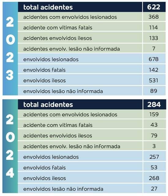 Ao todo, as rodovias estaduais contabilizam 3.283 mil acidentes de 2019 a 2024, sendo que 590 dessas ocorrências envolviam vítimas fatais. Ao todo, 687 pessoas morreram e 3.586 foram resgatadas com algum tipo de lesão.