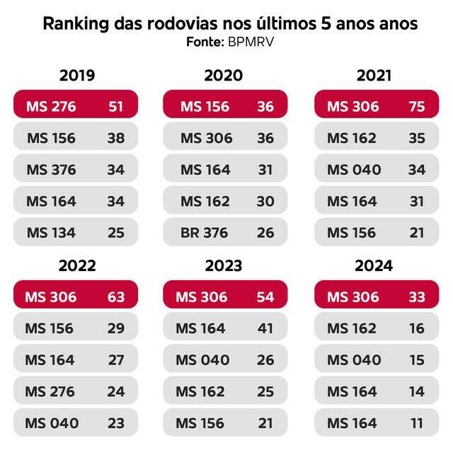 No top cinco de rodovias estaduais mais perigosas de Mato Grosso do Sul, a MS-306 se mantém em primeiro lugar pelo quarto ano consecutivo. Somadas, as rodovias analisadas serviram de cenário para 622 acidentes em 2023, sendo esse o número mais expressivo desde 2019. Neste ano, até 18 de junho foram registradas 284 ocorrências.