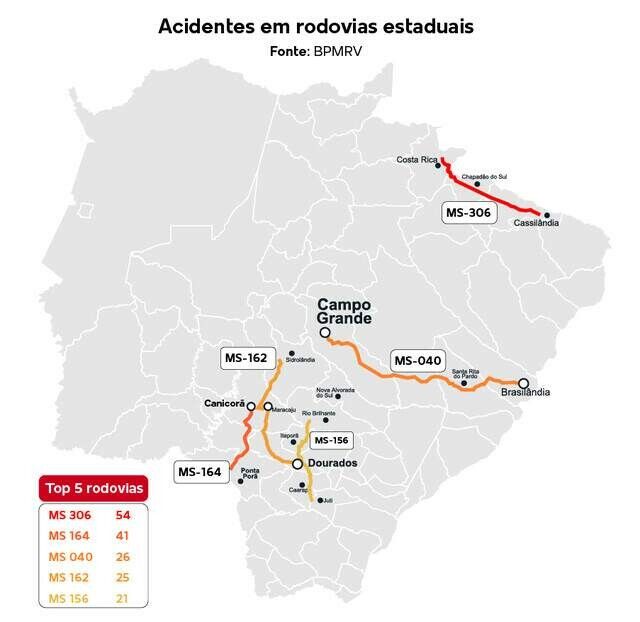 Responsável por ligar os municípios de Dourados, Itaporã, Amambai e Caarapó, a MS-156 fechou 2019 no 2º lugar com 38, em 2020 levou o 1º lugar com 36 acidentes, 2021 cravou o 5º lugar com 21 acidentes. Já em 2022, ela subiu para o 2º lugar com 29 acidentes e em 2023 voltou para a última posição com 21 acidentes. Neste ano, ela está em 4º lugar com 14 acidentes.Nas estatísticas, a MS-162 que interliga Sidrolândia, Dois Irmãos do Buriti, Maracaju e Dourados é uma que desde 2020 ‘bate ponto’ no ranking. Em 2021, a MS-040 que de Campo Grande passa por Santa Rita do Pardo e termina em Brasilândia foi outra que entrou e não saiu mais, ficando em terceiro lugar com exceção de 2022 quando foi superada pela MS-164.