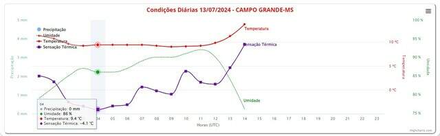 A menor temperatura registrada em Campo Grande pelo Inmet foi de 9°C, às 5h. Neste horário, devido às rajadas de vento de 33 km/h -, o frio foi de 5,06ºC.
