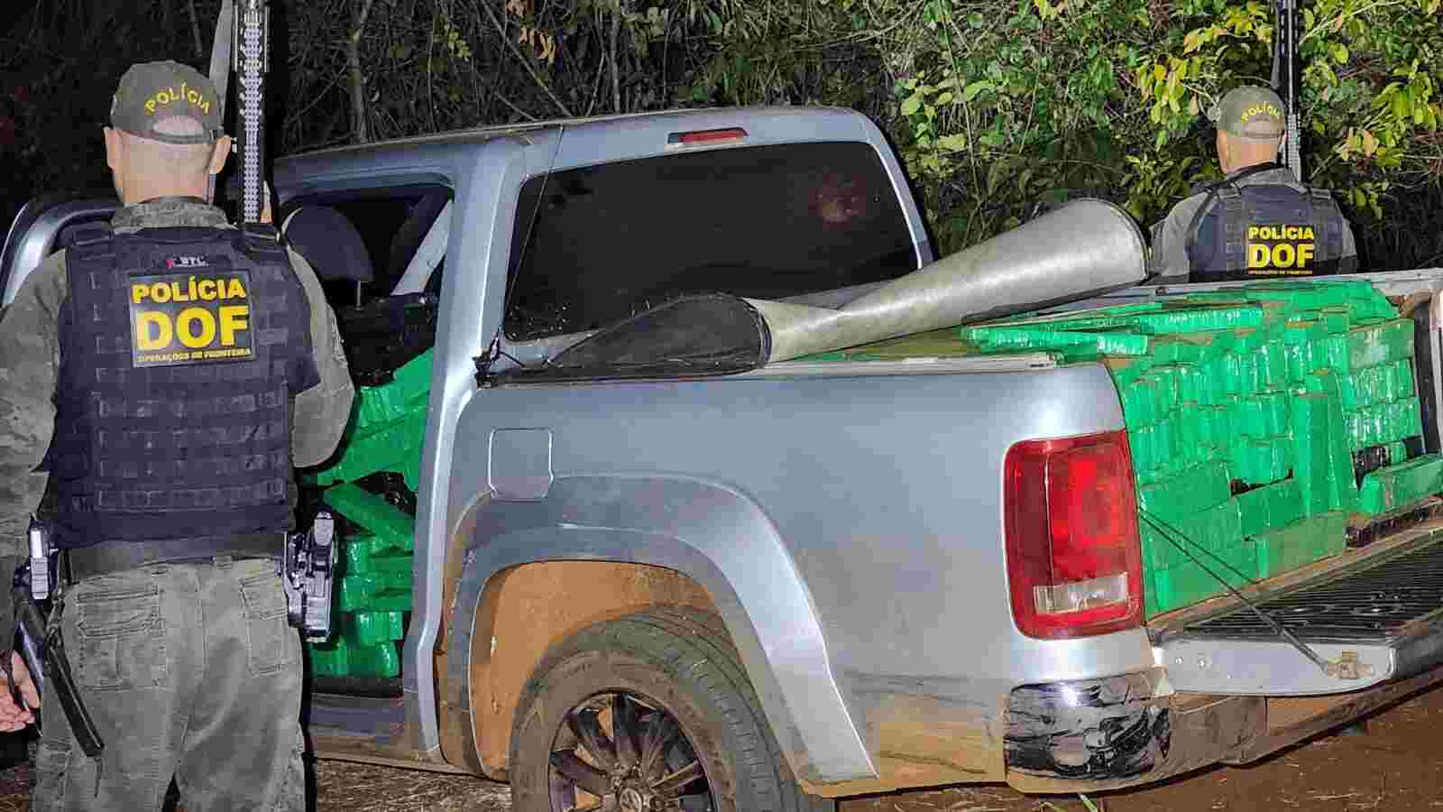 Ao realizar diligências na área informada, os policiais localizaram a caminhonete carregada com a droga. Equipes do DOF permanecem no local realizando buscas, mas nenhum suspeito foi encontrado.
