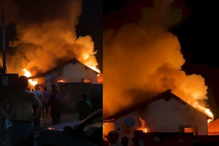 A casa foi toda tomada pelas chamas, com labaredas que sobem pelas janelas, porta e vãos do teto, gerando uma intensa nuvem de fumaça que encobre a residência.