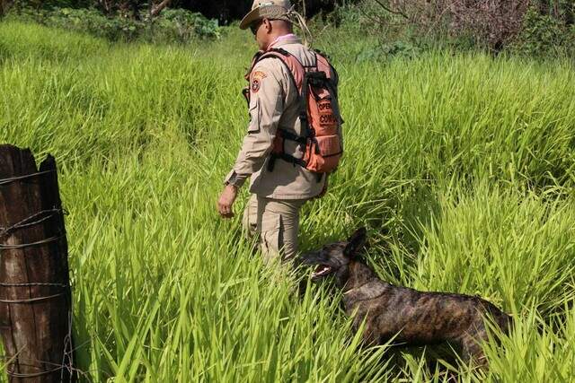 Nesta terça-feira (14), a bombeira Laika junto do sargento Thiago Kalunga iniciaram a procura pelo idoso em um terreno com matagal, que fica próximo à área do viaduto da BR-163, sobre a Rua Piracanjuba, perto do centro de distribuição da empresa Alvorada de materiais de construção.