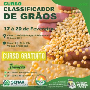 A Prefeitura de São Gabriel do Oeste, por meio da Secretaria de Desenvolvimento Econômico, em parceria com o Senar-MS e o STTAR-SGO, está oferecendo o curso gratuito de Classificador de Grãos. A capacitação acontecerá entre os dias 17 e 20 de fevereiro, no Centro de Qualificação Profissional, localizado na Rua Bahia, nº 2961.