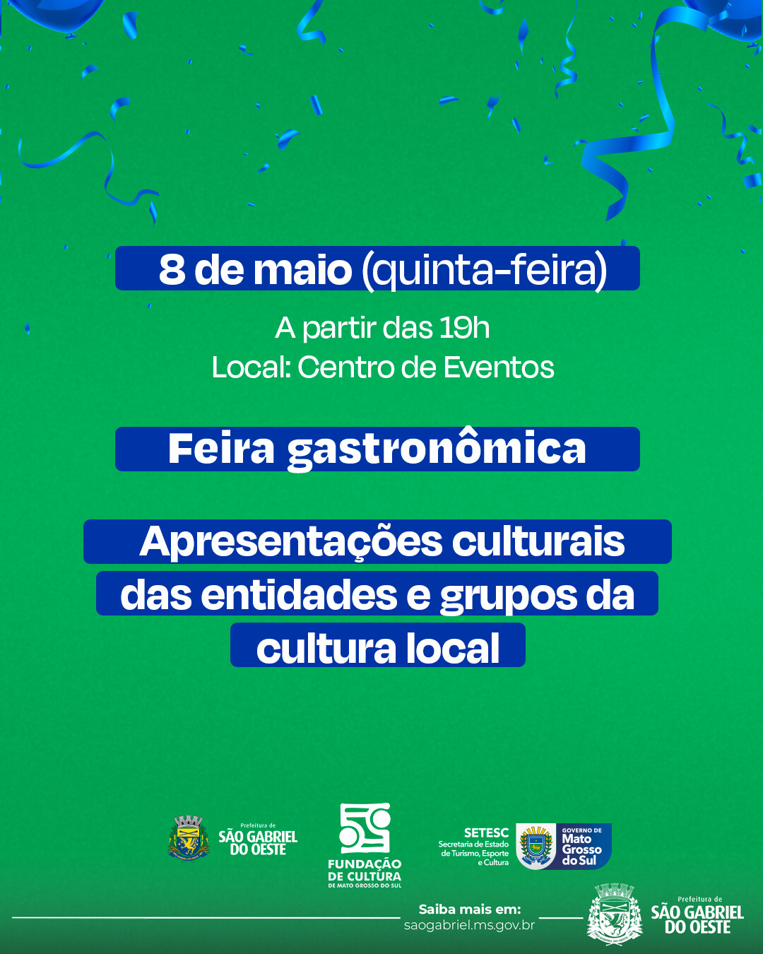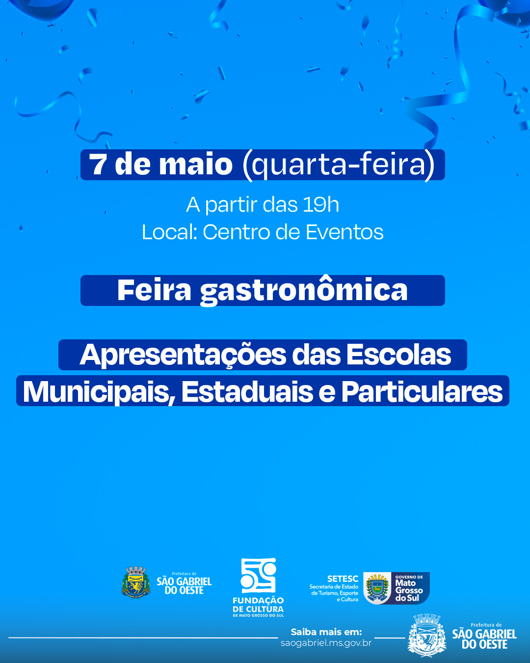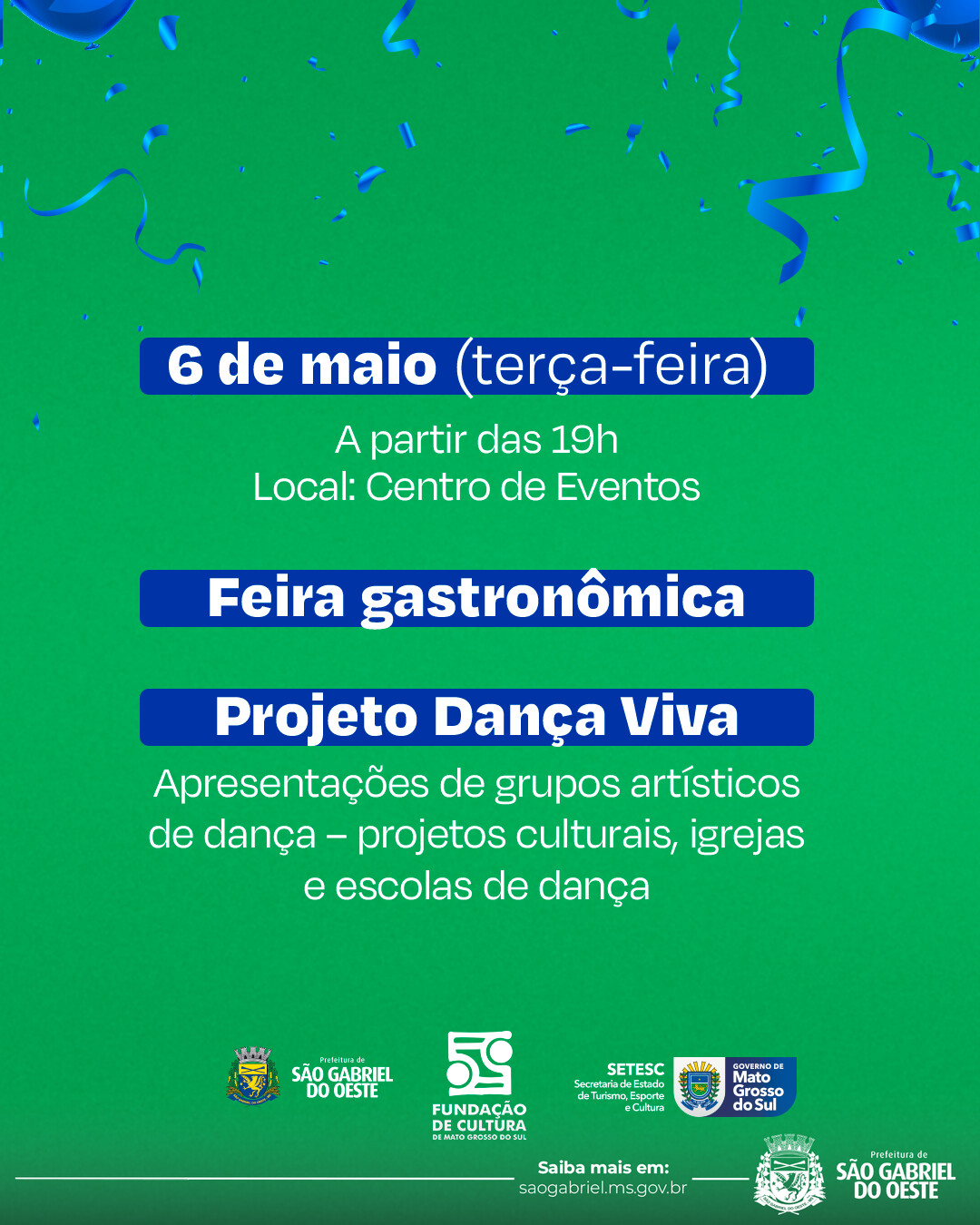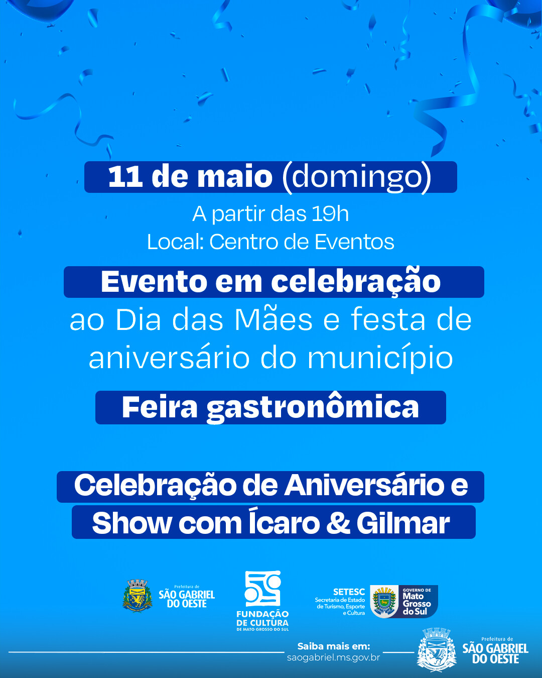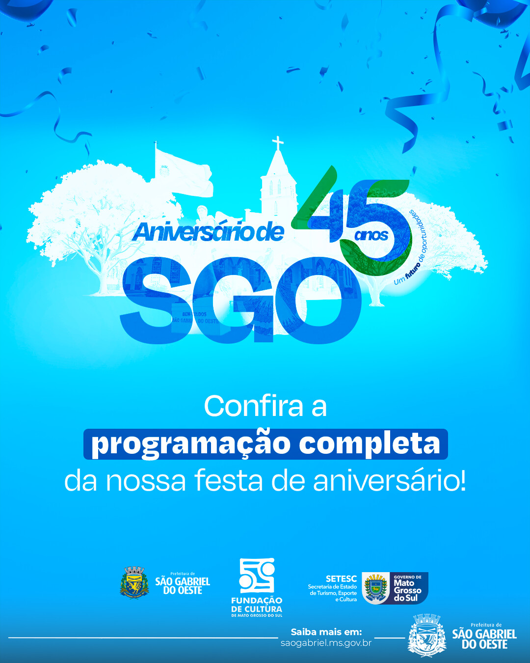 A Prefeitura Municipal convida toda a população para participar da programação comemorativa dos 45 anos de São Gabriel do Oeste.