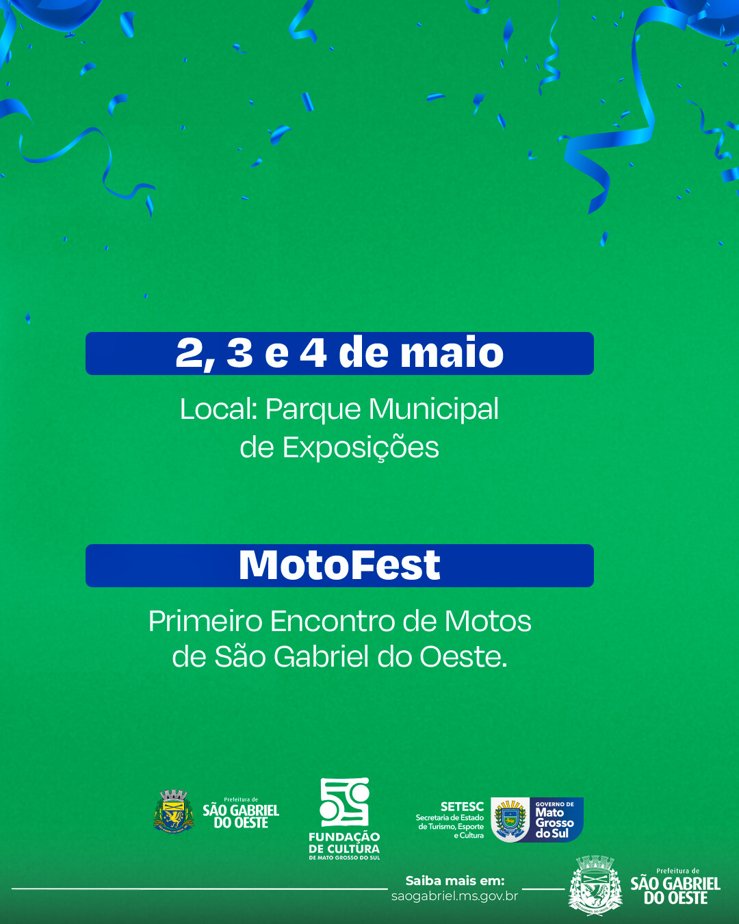 O município de São Gabriel do Oeste inicia as comemorações pelos seus 45 anos de emancipação político-administrativa com uma ampla programação que se estenderá por todo o mês de maio. As celebrações têm início no dia 2 de maio, com o Motoeste – Primeiro Encontro de Motos de São Gabriel do Oeste, e seguem com uma série de atividades culturais, esportivas, religiosas e institucionais voltadas à valorização da história, da identidade local e ao fortalecimento da integração com a comunidade.