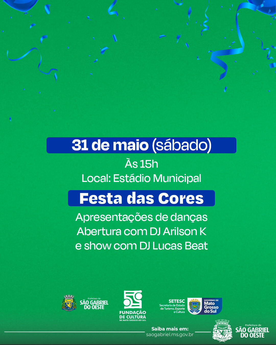 As festividades em alusão aos 45 anos de São Gabriel do Oeste contam com apoio essencial do Governo do Estado de Mato Grosso do Sul, por meio da Fundação de Cultura (FCMS). Essa parceria reforça a importância do município no contexto estadual e evidencia o compromisso do Governo em fomentar ações culturais e valorizar os municípios que contribuem para o desenvolvimento de Mato Grosso do Sul.