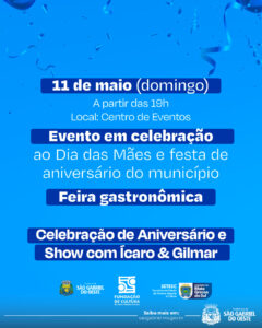 Entre os destaques da programação está o Ato Cívico em homenagem ao aniversário da cidade, que será realizado no dia 9 de maio. A solenidade marca a abertura do fim de semana festivo e incluirá o lançamento do pacote de obras “Viva + SGO”, além de apresentações artísticas, show com a dupla Vitor e Cadu, lançamento da nova camiseta do São Gabriel Esporte Clube e uma queima de fogos silenciosa. Um momento de união, reconhecimento das conquistas e celebração dos novos passos que o município trilha rumo ao futuro.