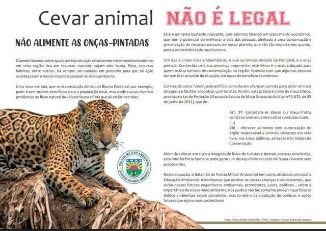 “Todo ano fazemos campanhas nas estradas sobre os animais silvestres, para evitar a ceva, maus-tratos e atropelamentos. Utilizamos cartazes e placas em locais estratégicos, especialmente no Pantanal e em Bonito, onde há grande circulação de turistas”, explica o major Diego Ferreira, comandante do 1º Batalhão da PMA.