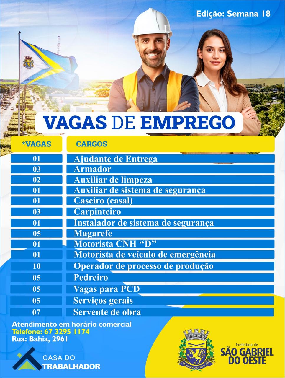 A Prefeitura Municipal de São Gabriel do Oeste, através da Casa do Trabalhador, está divulgando uma variedade de vagas de emprego. Essas oportunidades abrangem diferentes áreas e níveis de experiência, proporcionando uma série de opções para os interessados em ingressar ou retornar ao mercado de trabalho.
