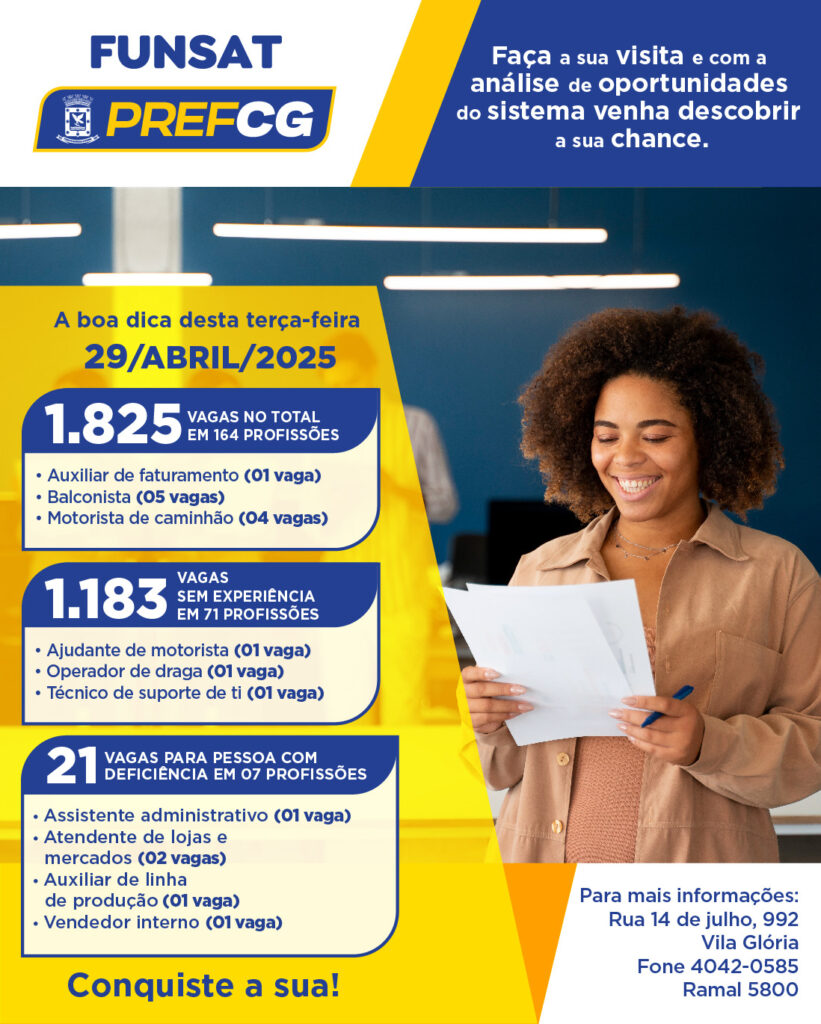A previsão é de 1.825 oportunidades de emprego na intermediação da Funsat (Fundação Social do Trabalho), desta terça-feira (29), com divulgação de vagas de 176 empresas, que recrutam em 165 profissões diferentes.