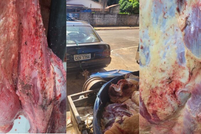 Colocada em uma carroceria sem controle de temperatura, a carne não possuía qualquer mínimo cuidado de higiene quando os agentes chegaram no açougue no momento em que o homem realizava a entrega.